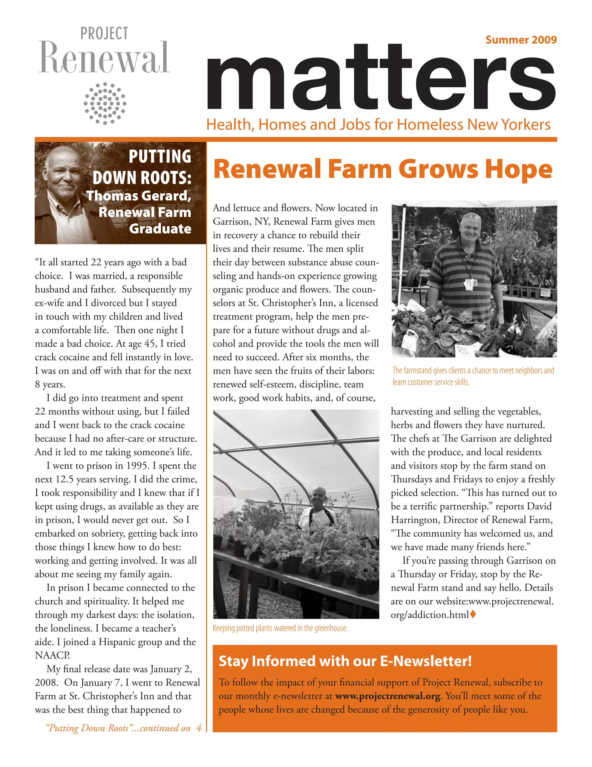 Renewal Farm in Garrison, NY gives men in recovery from substance abuse a chance to rebuild their lives through organic farming. The men split their time between counseling and growing produce and flowers. After six months, they have improved self-esteem, work skills, and the chance to sell their harvest. The farm has been welcomed by the local community. One graduate found Renewal Farm to be the best thing for his recovery after years of addiction and incarceration.