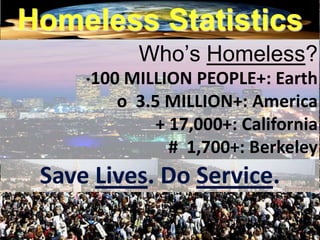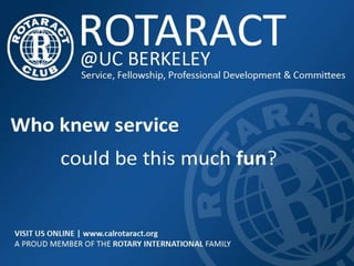 This document provides information about homelessness statistics globally and locally in California and Berkeley. It then summarizes the service activities that the Cal Rotaract club has participated in during September, including building a playground, renovating a home, and networking with Rotarians. The document outlines how to join the club, requirements for membership, and points/reward systems for participation. Upcoming events are listed for October. Contact information is provided at the end.