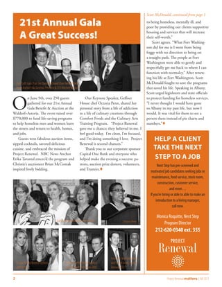 Scott McDonald considered suicide by jumping off the George Washington Bridge after losing his home, marriage, and job due to alcoholism and depression. He checked into Bellevue Hospital, but it was only at Project Renewal's Fort Washington Men's Shelter that he began to rebuild his life with help from case managers and services. Project Renewal advocates fought proposed budget cuts that would eliminate programs helping homeless New Yorkers find housing and jobs. While some cuts occurred, advocacy prevented worse outcomes and secured funding to continue critical housing and medical services. At Project Renewal's annual gala, over $770,000 was raised and keynote speaker Octavia Penn shared how the organization helped her recover from addiction through culinary training.