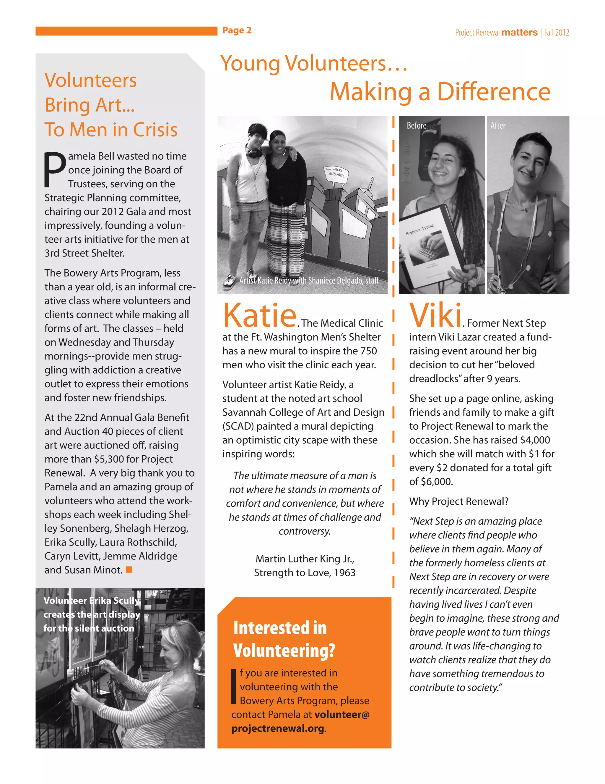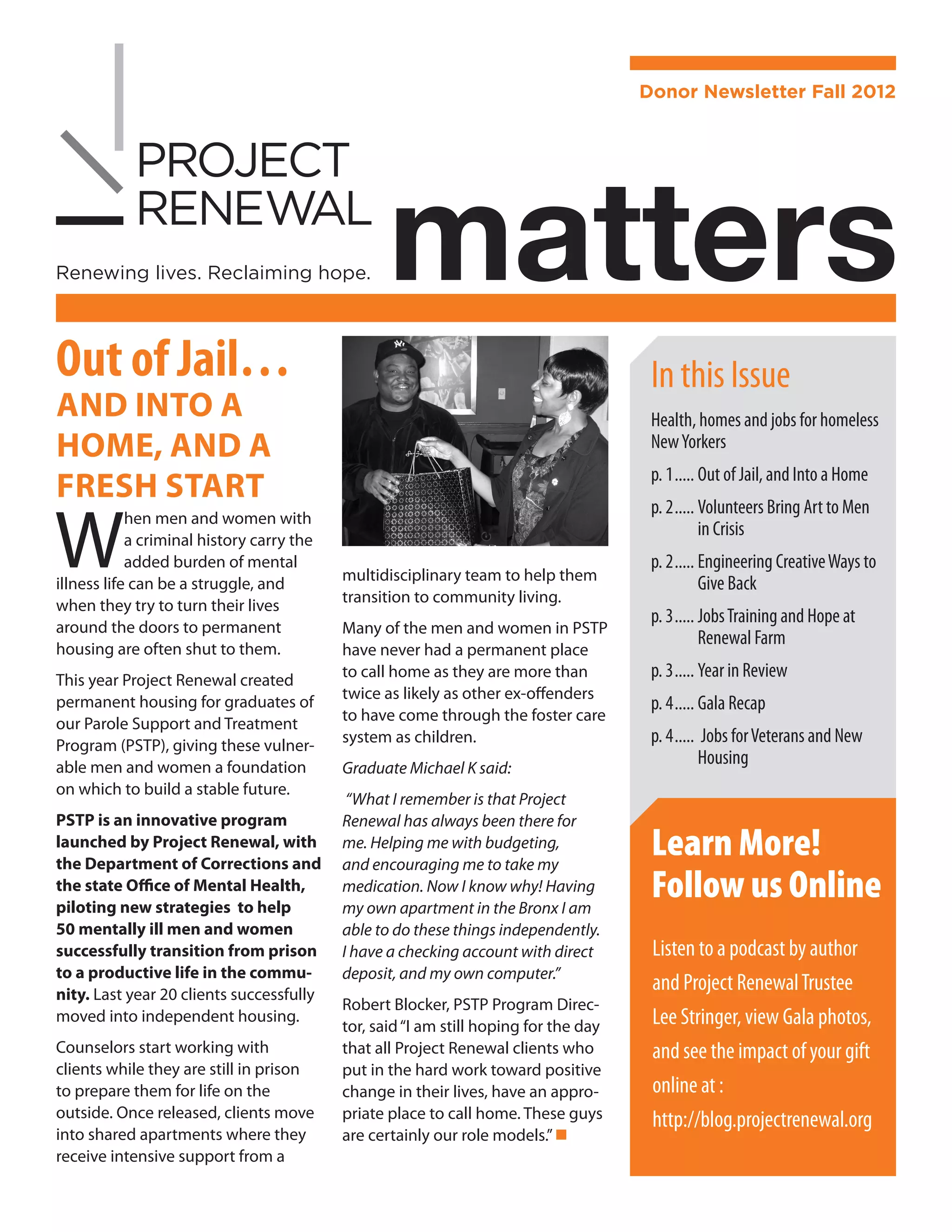 Project Renewal created permanent housing for graduates of their Parole Support and Treatment Program (PSTP), giving vulnerable individuals with criminal histories and mental illness a stable foundation. The PSTP uses a multidisciplinary team to help clients transition from prison to community living. Many clients have never had a permanent home and were in foster care. A client thanked Project Renewal for their support with budgeting and medication, saying his new apartment allows him independence. Volunteers started an arts program at a men's shelter to provide a creative outlet and new friendships for those struggling with addiction.