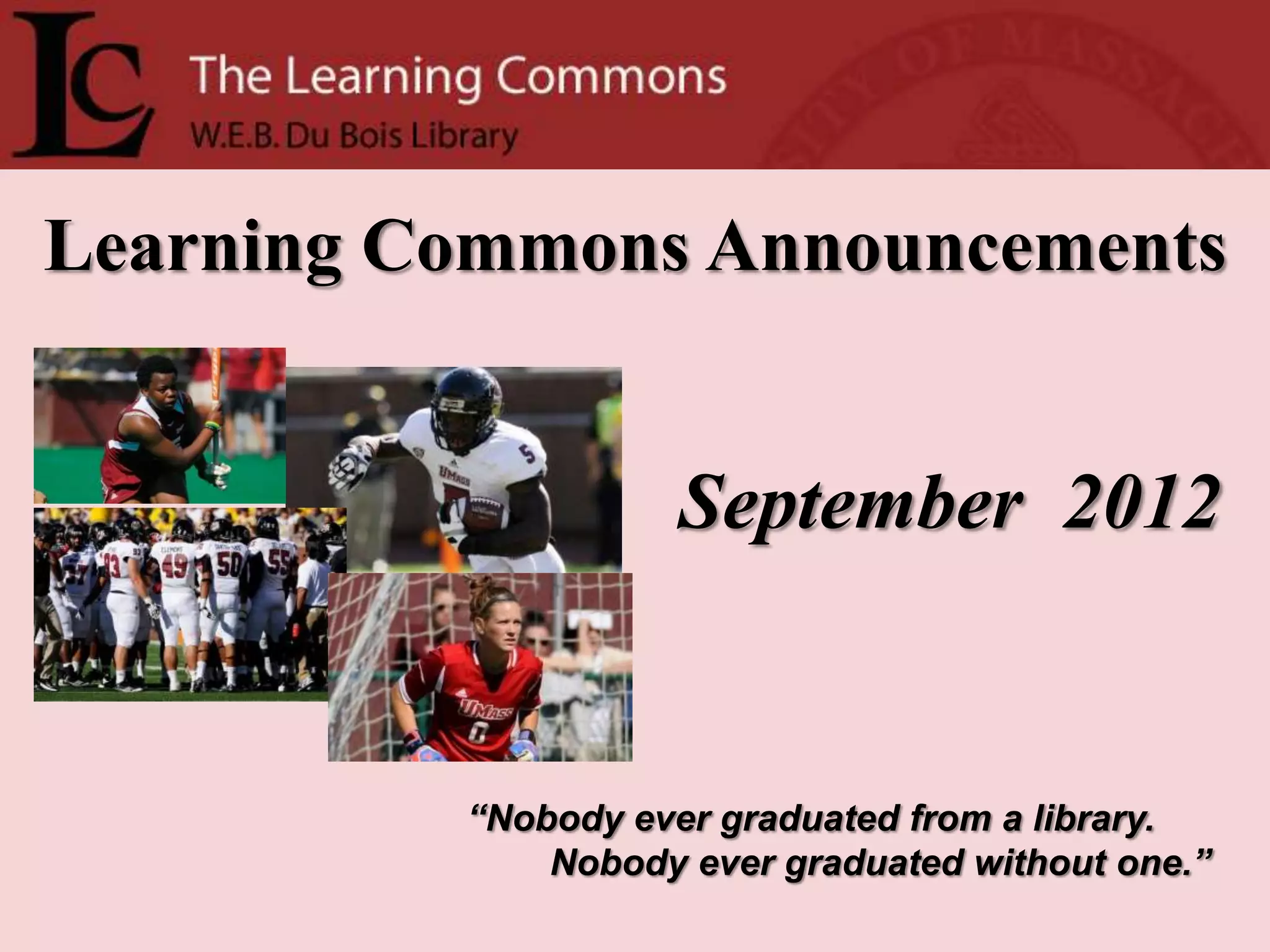 The document provides announcements from the UMass Amherst Learning Commons in September 2012. It includes information about a live webcam of Peregrine Falcons nesting on the roof of the Du Bois Library, new Dell laptops available for borrowing in the library, and expanded services at the Circulation/Reserves desk. It also announces the launch of Credo, the library's online digital repository.