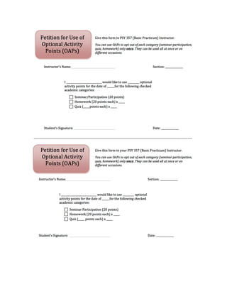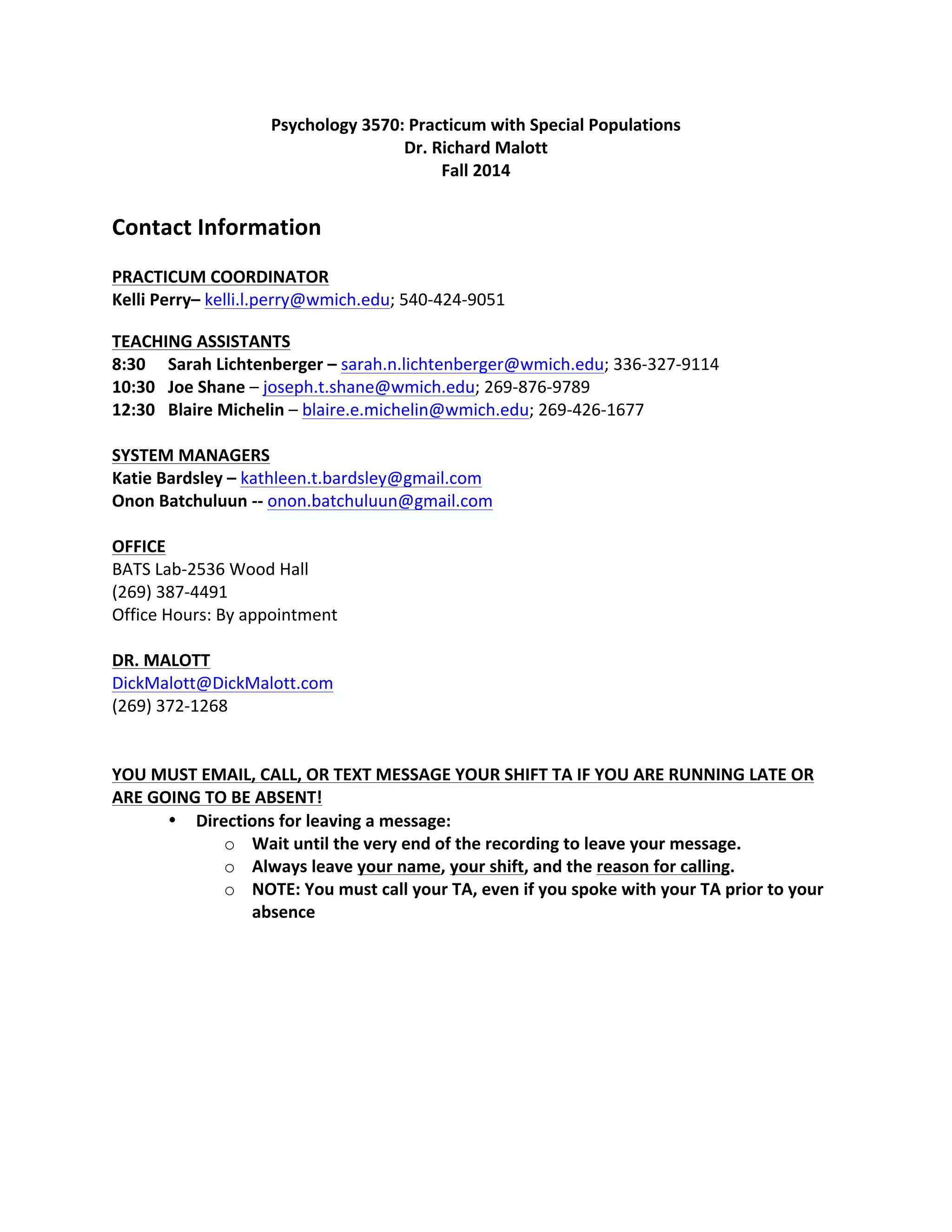 This document provides information for students enrolled in the Psychology 3570 practicum at WoodsEdge Learning Center. It outlines the schedule and expectations for the practicum. Students are expected to work 10 hours per week at WoodsEdge in 2-hour shifts. They must also attend a weekly 2-hour seminar. The seminar will include discussions of assigned readings from the textbook "Let Me Hear Your Voice" as well as presentations from the teaching assistant. Students will be graded based on their participation at WoodsEdge and in seminars, homework assignments, quizzes over the readings, and professionalism/monitoring evaluations.