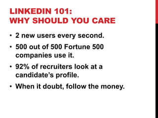 This document provides an overview of using LinkedIn for professional purposes and effective business writing. It outlines 9 steps for using LinkedIn, including enhancing your profile, connecting with others, and engaging on the site. Guidelines are also given for writing clearly and concisely in various business contexts like memos. Key recommendations include using active voice, varying sentence structure, and defining any complex terms. The document emphasizes the importance of brevity, clarity, and consistency in professional communication.
