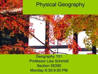 This document provides an overview of a physical geography course. It outlines the course objectives which are to introduce students to basic concepts in physical geography including the four environmental spheres of atmosphere, hydrosphere, lithosphere, and biosphere. It details required textbooks, exams, quizzes, assignments, and presentations for the course. Students are expected to demonstrate understanding of geographic concepts and the distribution of natural phenomena through map studies. The syllabus emphasizes academic honesty and provides contact information for the professor.