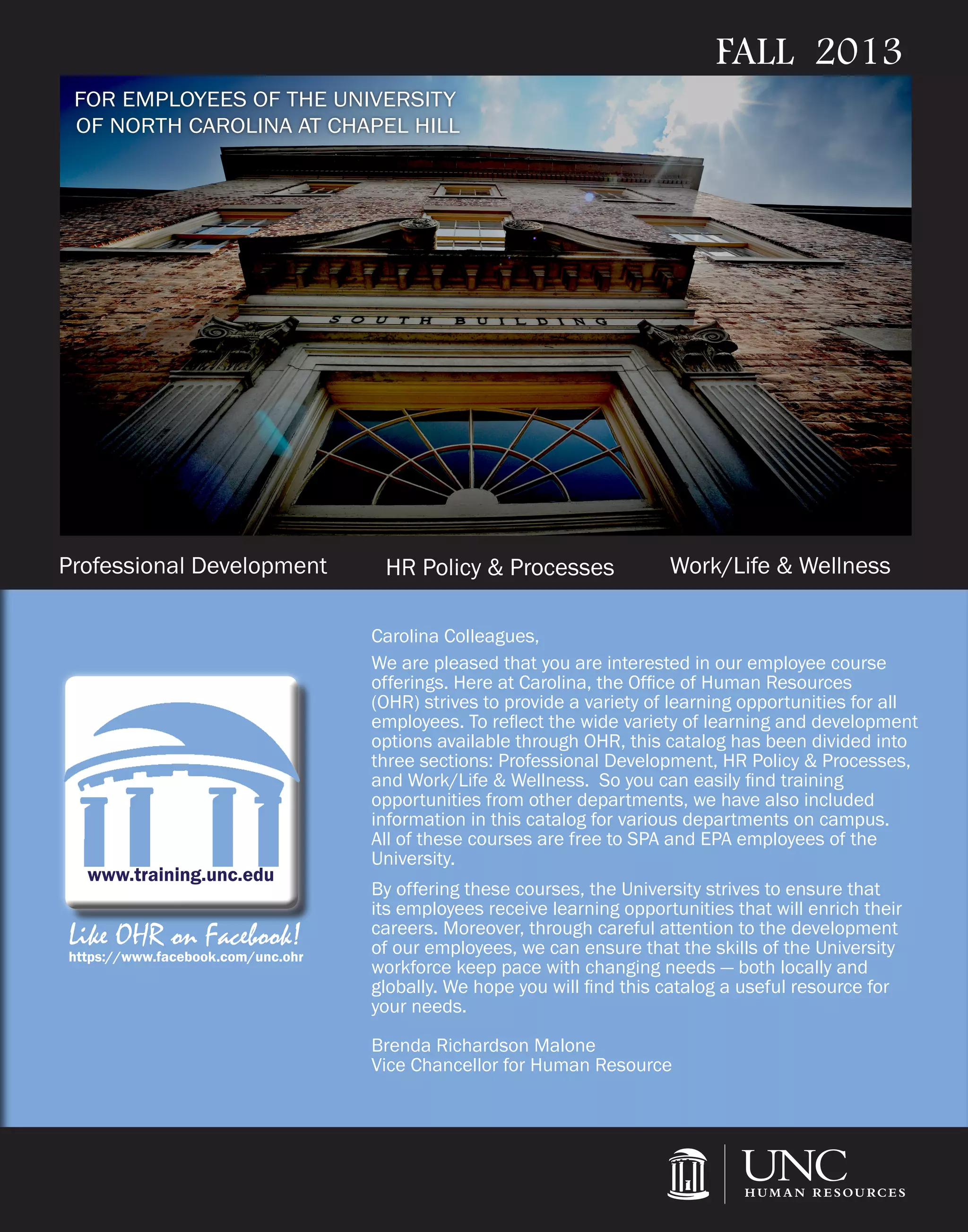 The document is a course catalog from the Office of Human Resources at the University of North Carolina at Chapel Hill, detailing various employee training opportunities focused on professional development, HR policies, and work/life wellness. It outlines a range of courses available for free to employees, along with class schedules and descriptions to improve job-related skills. Additionally, the catalog highlights online resources for technical training and emphasizes the university's commitment to employee development in response to changing workforce needs.