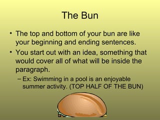 The document provides an analogy comparing building a well-constructed paragraph to making a burger. It explains that the introductory sentence acts as the top bun, providing an initial idea. Supporting details, examples, and quotes fill the body in the same way condiments and the burger patty fill the bun. A concluding sentence ties everything together, just as the bottom bun closes the burger.