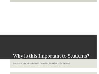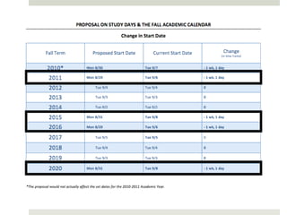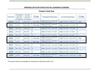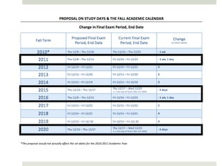The document proposes adjusting Columbia University's fall academic calendar to end the semester earlier in years where Labor Day falls late in September. It found through a student survey that having exams and the semester end on December 23rd caused stress, interrupted travel plans, and inadequate preparation time. Looking at a 10-year period, only 4 years would require starting 1 week earlier to avoid ending on December 23rd. This proposal aims to alleviate stress for students while accommodating faculty constraints by only adjusting start dates in those specific years.