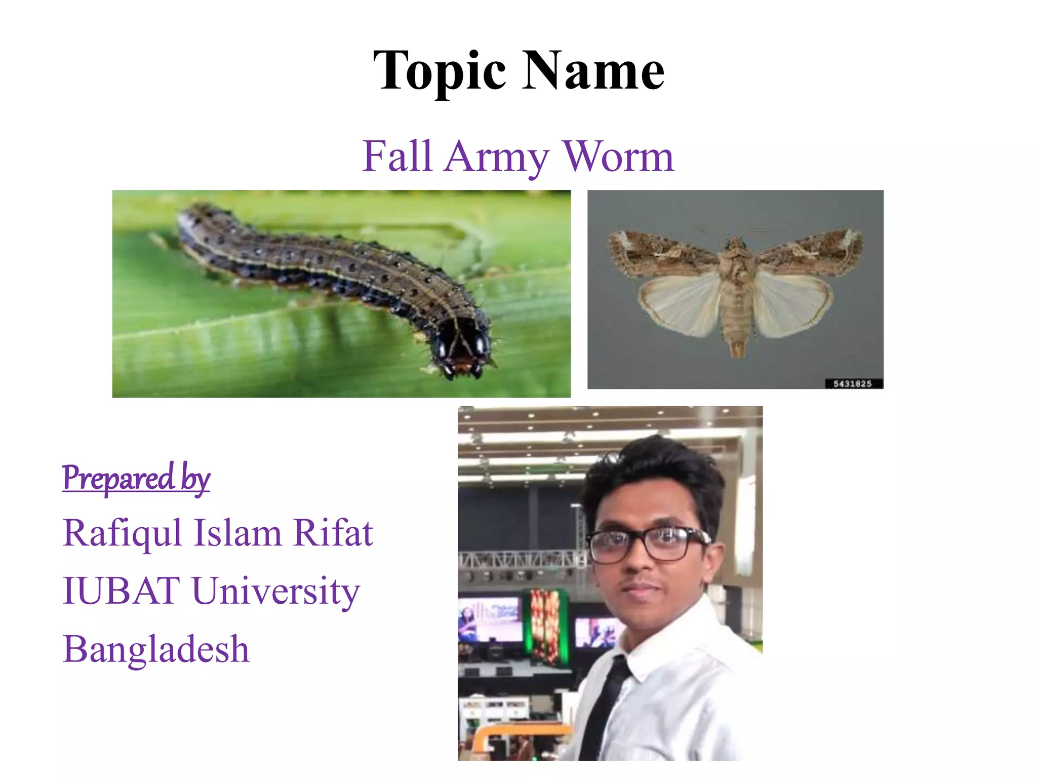 The Fall Army Worm (FAW), first identified in America, spread to Africa in 2016 and was recorded in India and Bangladesh by 2018, posing a significant threat to over 80 crop types, particularly maize. This pest can migrate vast distances and thrives in both summer and winter, leading to severe damage to crops, especially through caterpillar feeding patterns. Control measures include deploying pheromone traps, flood irrigation, and the use of organic pesticides to manage its impact on agriculture.