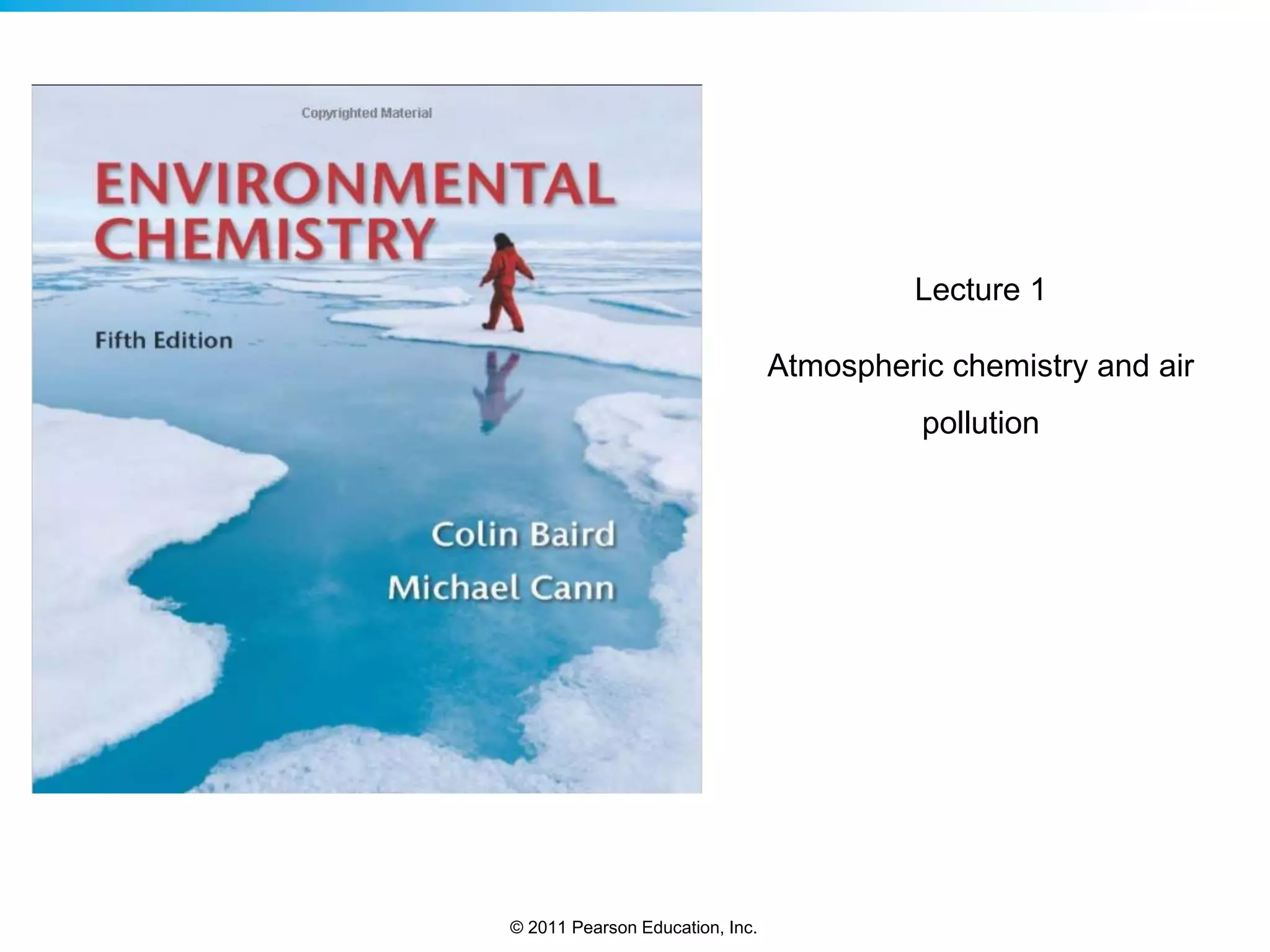 This document provides an overview of atmospheric chemistry and air pollution. It begins by describing the layers of the atmosphere and how solar energy and global wind patterns influence weather and climate. It then discusses various natural and human-caused sources of air pollution, including volcanoes, fires, dust storms, vehicles, factories, and coal burning. Several major air pollutants are explained in detail, along with the problems of smog and stratospheric ozone depletion. Solutions to reduce air pollution are also reviewed.