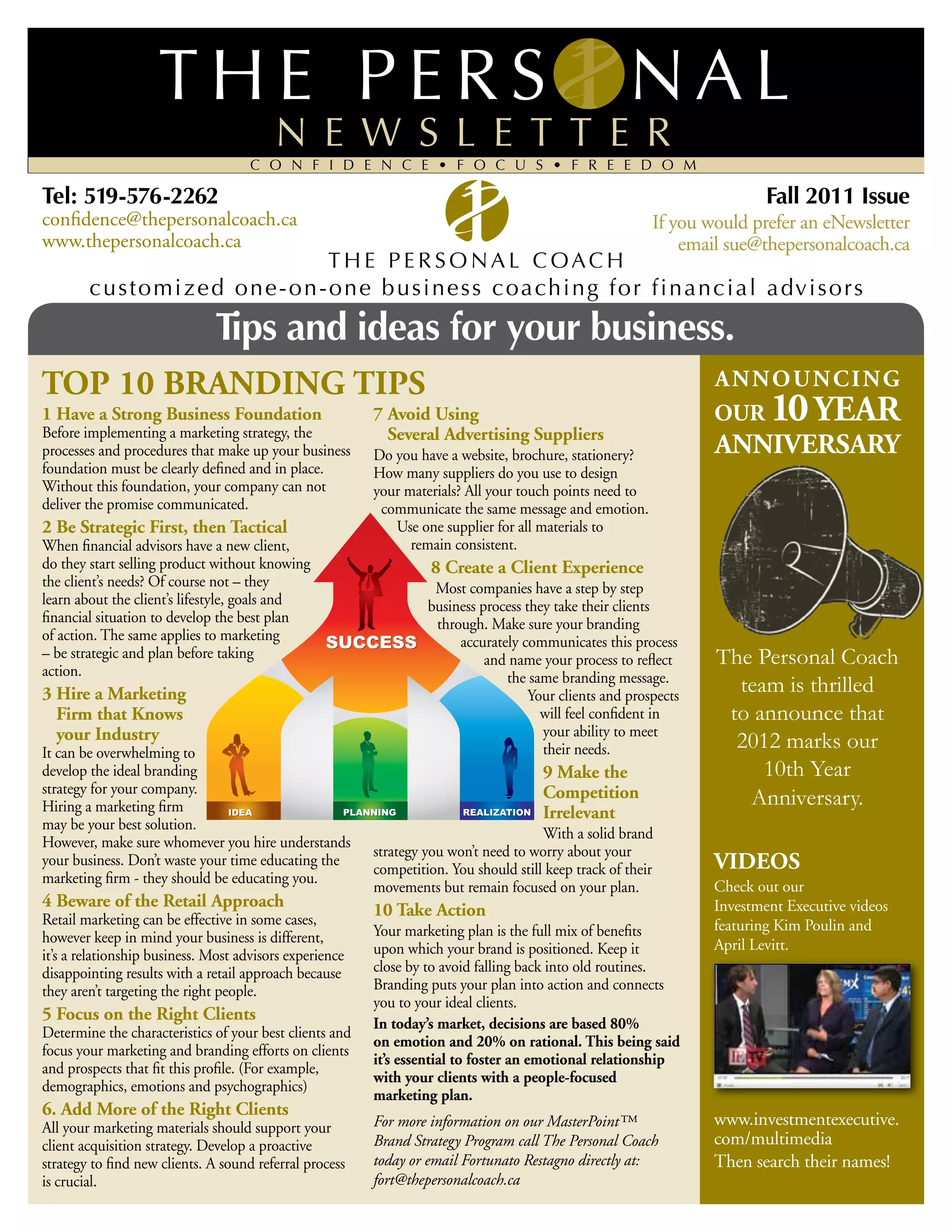 2. It also announces that The Personal Coach team is celebrating their 10th anniversary in 2012 and provides links to videos and the company website for more information.