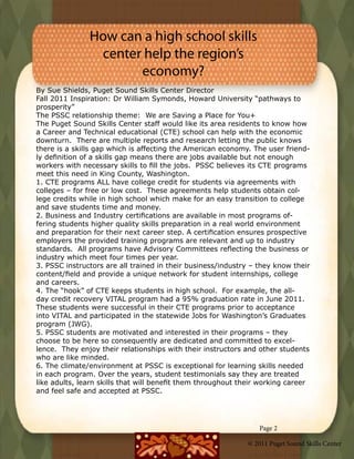 The Puget Sound Skills Center was donated a fire engine to allow students to learn skills on equipment they will use in their careers. The newsletter also announces upcoming events and introduces the student advisory committee officers. It provides summaries of the classes available at PSSC, including engineering design, Microsoft IT Academy, marine science technology, and fashion design. Finally, it recognizes JAG specialist Marilyn Conger for her outstanding work bringing the JAG program to PSSC.