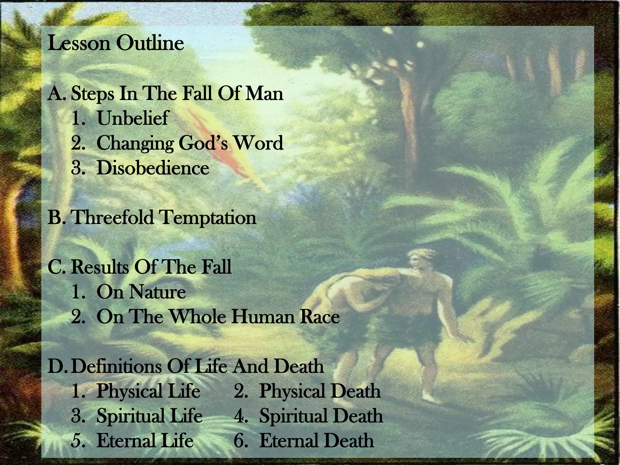 The document discusses the fall of man according to the Bible. It describes the steps in the fall as unbelief, changing God's word, and disobedience. Eve was tempted in three ways - by what was good for food, pleasant to the eyes, and what was desired to make one wise. The results of the fall were curses on nature and consequences for the whole human race, including physical death, spiritual death, and eternal death. It defines physical life, physical death, spiritual life, spiritual death, eternal life, and eternal death.