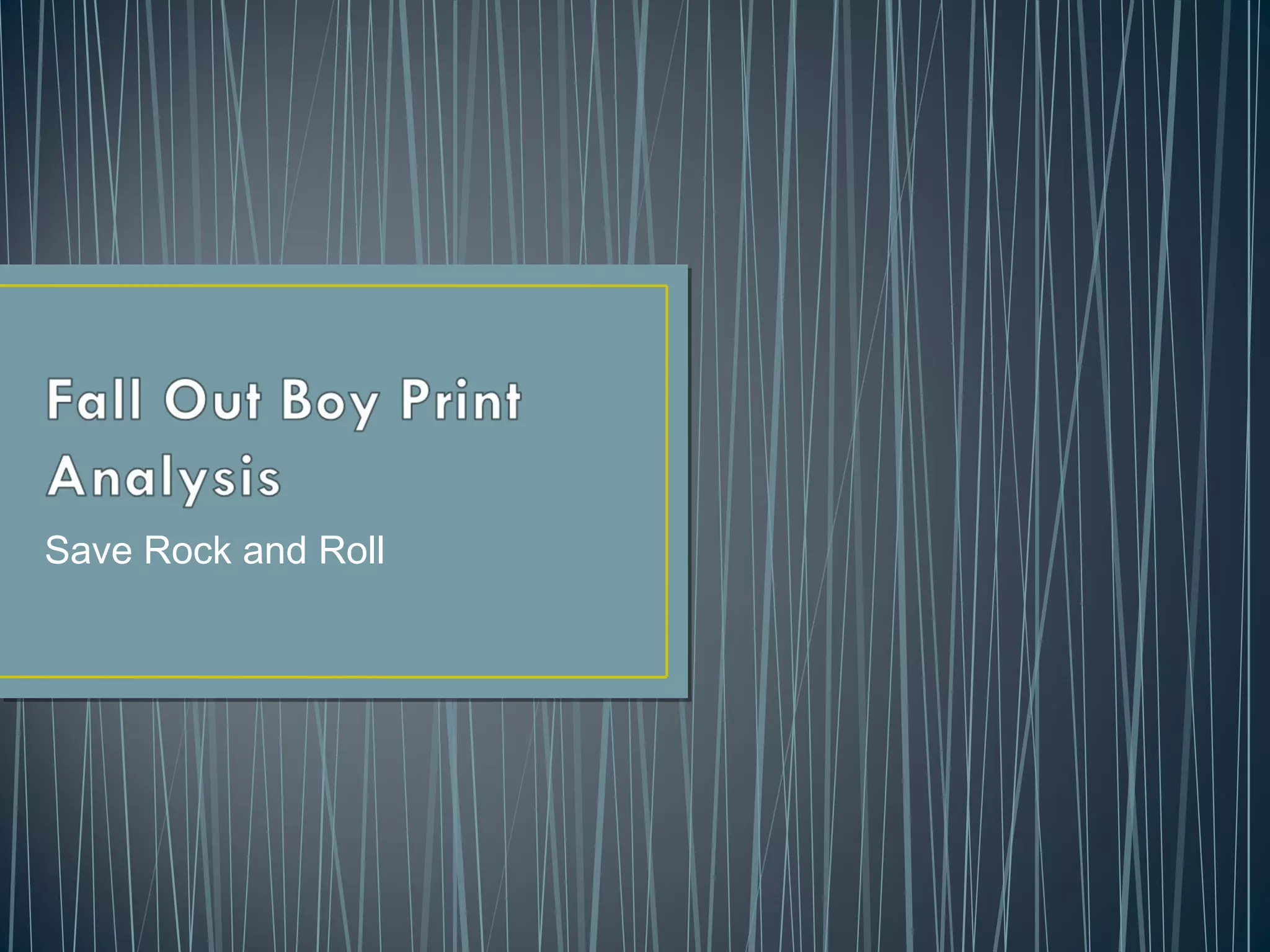 Fall Out Boy uses various branding techniques and imagery across their Save Rock and Roll album packaging and promotional materials to convey their themes of revolution and fighting against the system. The packaging utilizes red and black colors symbolizing revolution. Fonts, logos, and imagery are used inconsistently to seem non-uniform and subvert conventions of the rock genre. Promotional posters vary in styles from typical rock imagery to more tongue-in-cheek cartoons to attract both new and existing fans. Overall, the diverse branding reinforces their messages of change and defiance through traditional and unconventional means.
