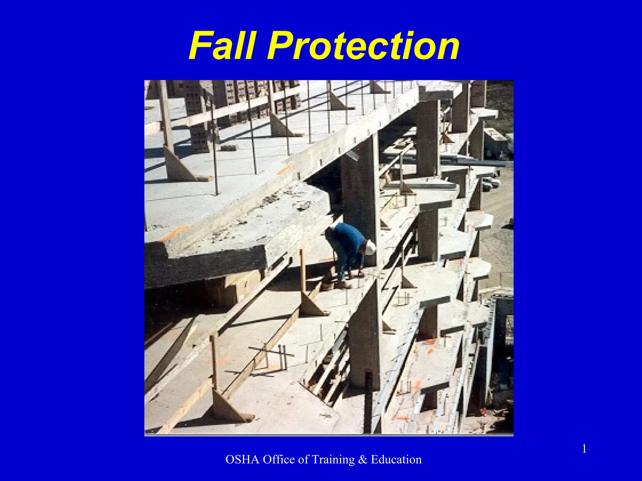 Falls are the leading cause of deaths in the construction industry, with most fatalities occurring from falls of less than 6 feet. This presentation discusses fall protection methods including guardrails, safety nets, and personal fall arrest systems. Employers must provide fall protection training and ensure protection measures are in place when employees are working at heights of 6 feet or more from walkways, edges, holes, roofs, and other unprotected areas.