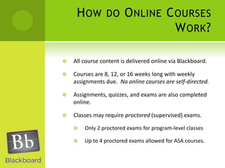 This document provides an overview of how online courses at Ivy Tech work, including that courses are delivered through Blackboard, last 8-16 weeks with weekly assignments, and may require proctored exams. It outlines the technology, browser plugins, and account creation needed to take online courses and access course content. It also offers tips for ordering books, accessing courses, communicating with instructors, dealing with problems, using campus resources, and asks students to contact the Distance Education Coordinator with any questions.