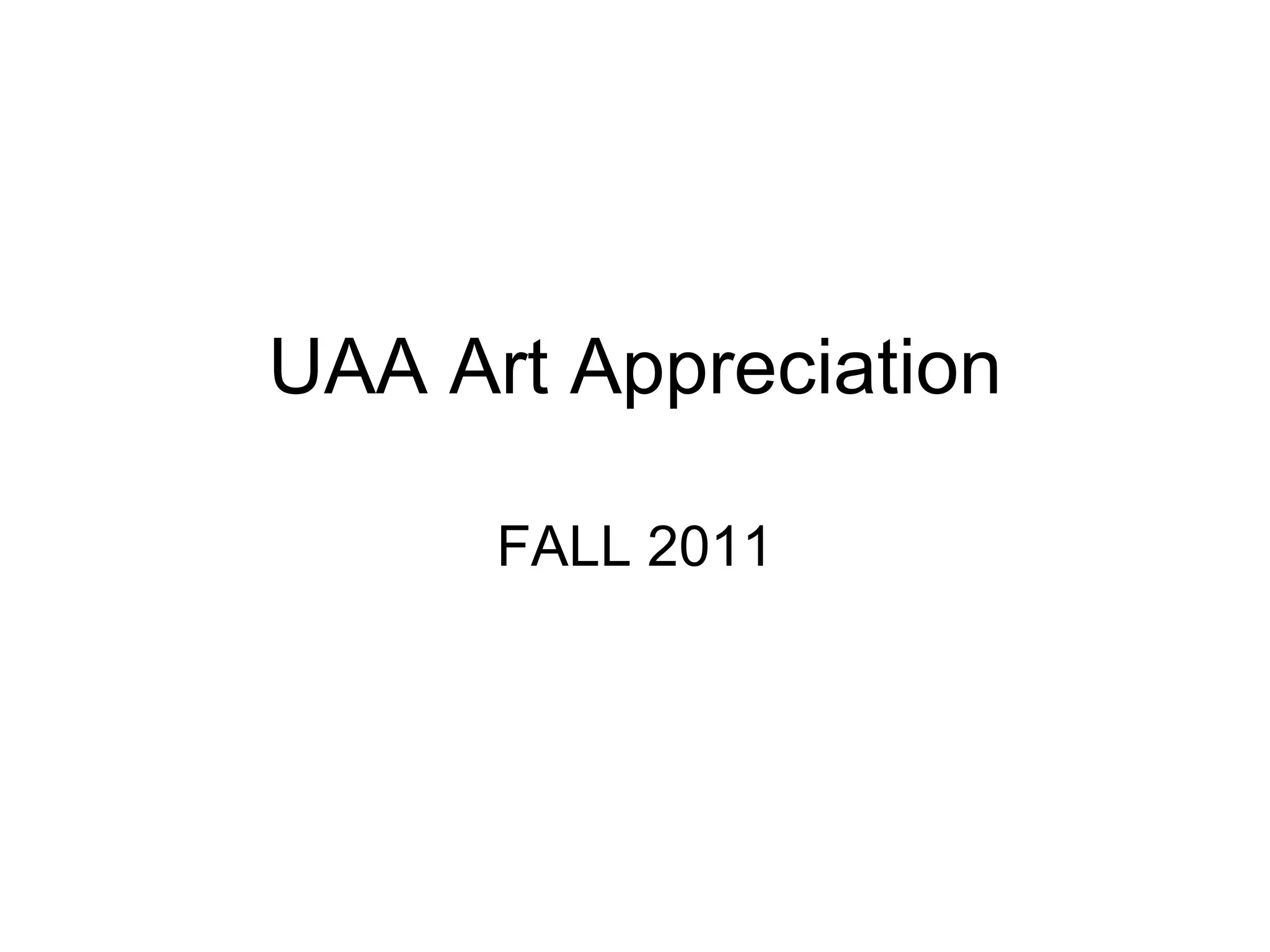 This document provides an overview of an art appreciation course at the University of Alaska Anchorage in the fall of 2011. It discusses various topics that will be covered such as definitions of art, visual elements, principles of design, different artists and artworks, techniques like painting and drawing, art criticism, and field trips. The course will examine art from various cultures and time periods with the goal of helping students understand and appreciate art on different levels.
