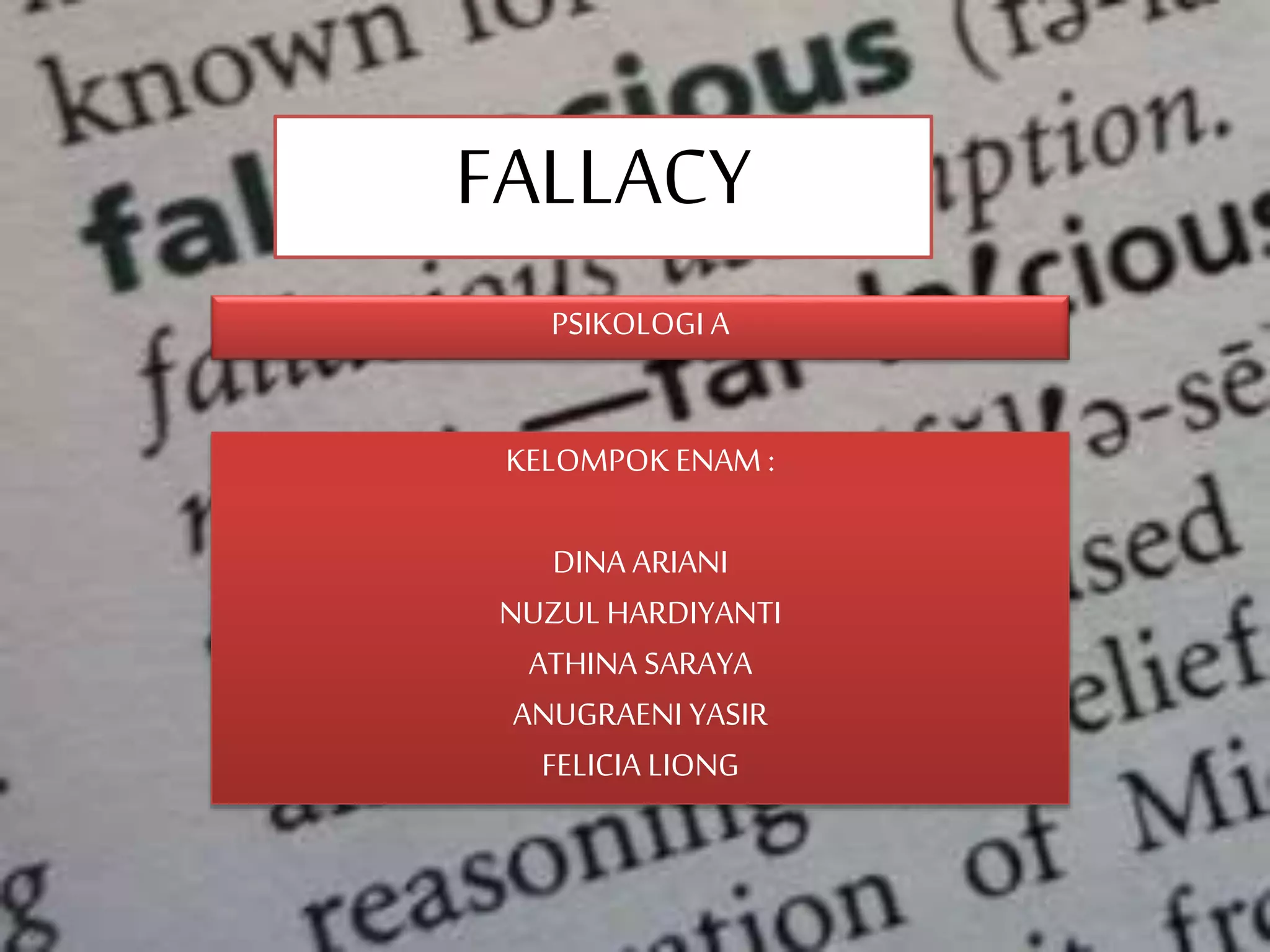 Dokumen ini membahas berbagai jenis fallacy atau kekeliruan dalam penalaran, termasuk penyalahgunaan bahasa dan relevansi. Contoh-contoh diberikan untuk masing-masing jenis fallacy, seperti fallacy of composition, fallacy of division, dan lain-lain, menggambarkan bagaimana kesalahan dalam logika dapat terjadi. Pemahaman tentang fallacy ini penting untuk meningkatkan kemampuan berpikir kritis dan analisis argumentatif.