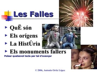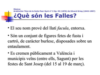 Música: ArabischerTänz de la Suite Peer Gynt nº 2 Op. 55 (1876) de Edvard Grieg (1843-1907) ¿Què són les Falles? El seu nom prové del llatí facula , entorxa. Són un conjunt de figures fetes de fusta i cartró, de caràcter burlesc, disposades sobre un entaulament. Es cremen públicament a València i municipis veïns (entre ells, Sagunt) per les festes de Sant Josep (del 15 al 19 de març).