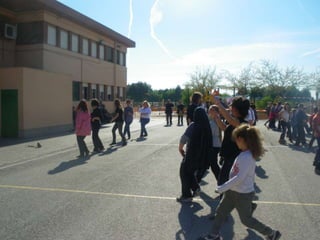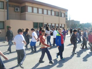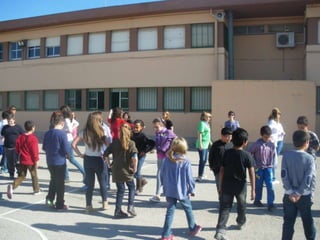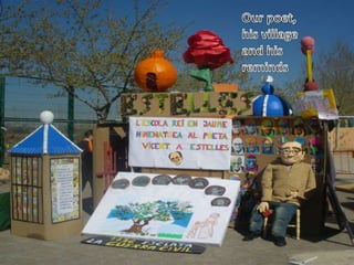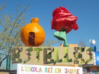 The document describes events at a school in 2014, including pupils and teachers dancing a Valencian dance and references to poems by Jaume Estellés, including the moon, a paper rose, red pepper, and olive trees. The school year and a burning preparation are also mentioned.