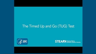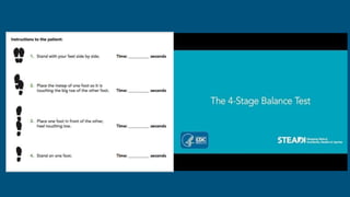 This document discusses tools and techniques for falls assessment and prevention. It covers supine to sit transfers, sit to stand movements, phases of rising from a chair, standing balance strategies, gait characteristics of fallers, turning risks, types of assisted walking devices, and stair negotiation. Exercises are also mentioned as part of falls prevention.