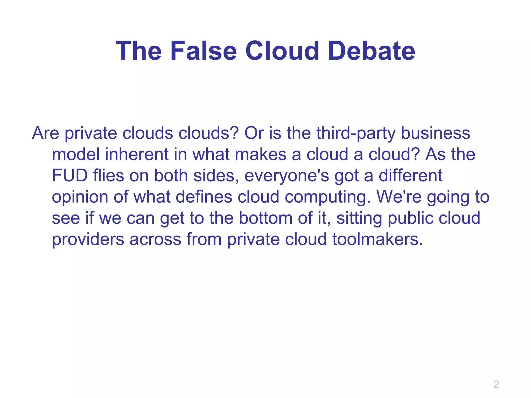 The document discusses the debate around private clouds versus public clouds. It presents perspectives from various industry experts and panelists on whether private clouds can truly be considered clouds and the advantages and disadvantages of private versus public clouds. Experts expressed mixed views, with some arguing private clouds are just data center modernization and not true clouds, while others saw potential benefits of private clouds for certain organizations.