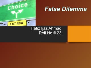 The document defines and provides examples of the logical fallacy known as false dilemma, where only a limited number of options are presented as available, when in reality there are more options. The examples given include a political phrase presenting the options of loving America or leaving it, as well as two examples from The Crucible play where characters are given only two choices when more exist.
