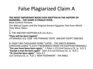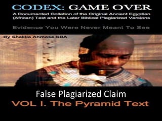 The document critiques claims by Shakka regarding parallels between ancient Egyptian texts and later biblical scriptures, particularly focusing on themes of rebirth and resurrection. It argues that Shakka fails to provide cultural context or recurring themes inherent to the original Egyptian texts, which is essential for proper interpretation. The text emphasizes the importance of understanding the original narratives and contexts over simplistic claims of plagiarism.
