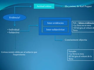 Actitud críticaEls 3móns, de Karl PopperEvidència?Inter-evidènciesFals= falses evidènciesLa Terra no es mou - 3.