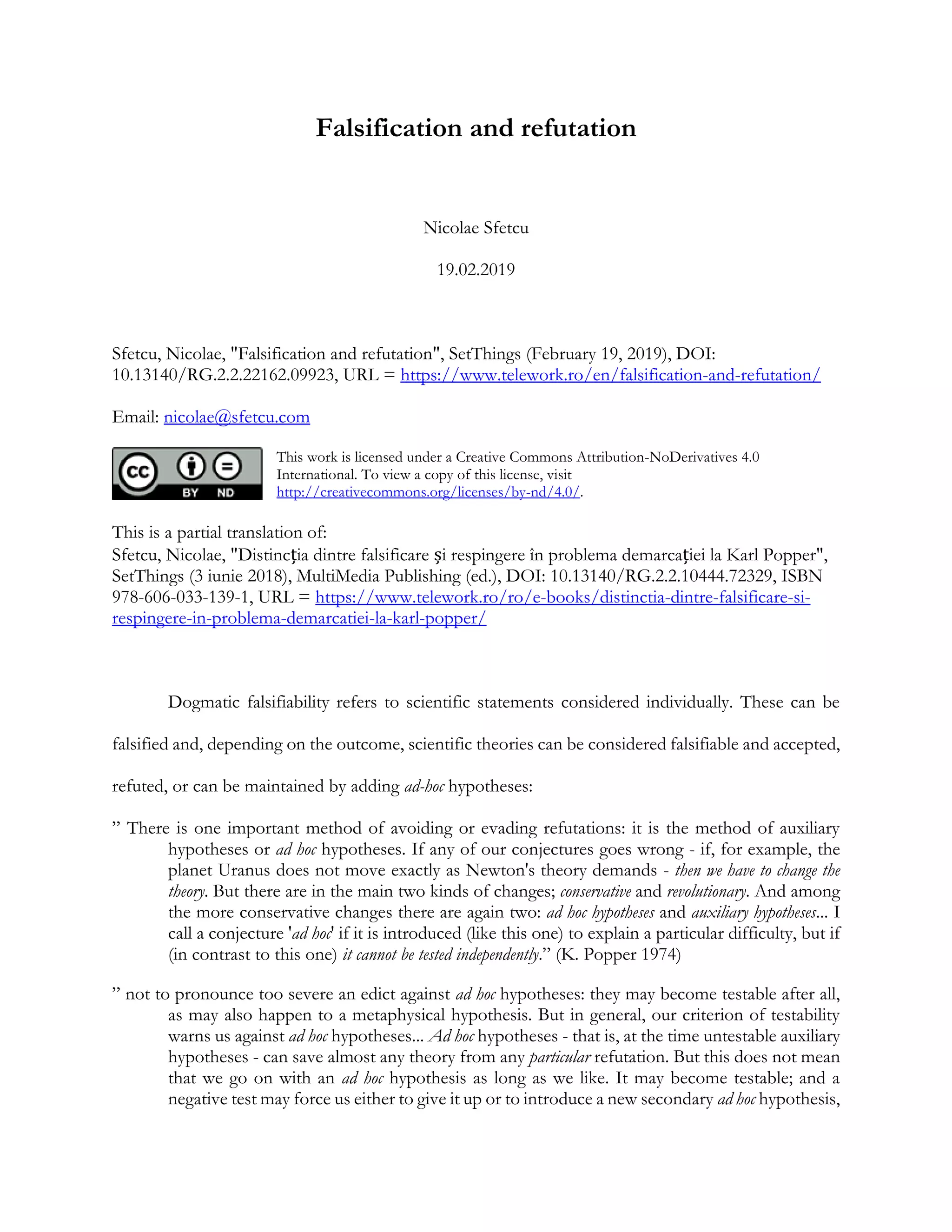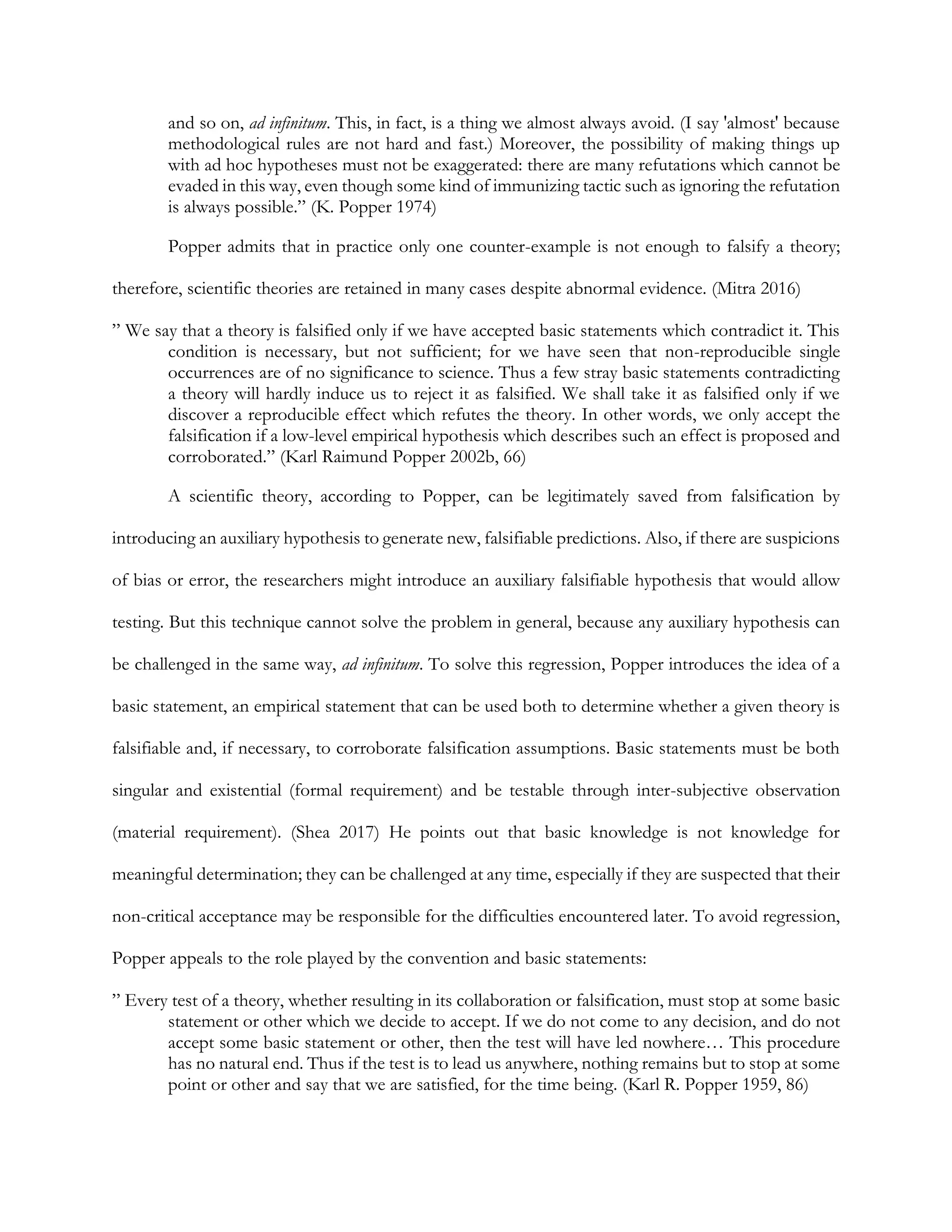 The document discusses the concepts of falsification and refutation in the context of Karl Popper's philosophy of science, emphasizing the role of auxiliary hypotheses in potentially saving theories from refutation. It highlights the importance of basic statements for determining a theory's falsifiability, and introduces the idea of 'verisimilitude' as a way to measure scientific progress towards truth. Additionally, it critiques the limitations of solely relying on falsifiability to distinguish science from non-science.