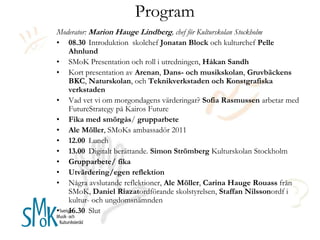 ProgramModerator: Marion HaugeLindberg, chef för Kulturskolan Stockholm08.30 Introduktion skolchef Jonatan Block och kulturchef Pelle AhnlundSMoK Presentation och roll i utredningen, Håkan Sandh Kort presentation av Arenan, Dans- och musikskolan, Gruvbäckens BKC, Naturskolan, och Teknikverkstaden och Konstgrafiska verkstadenVad vet vi om morgondagens värderingar? Sofia Rasmussen arbetar med FutureStrategy på Kairos FutureFika med smörgås/ grupparbeteAle Möller, SMoKs ambassadör 201112.00 Lunch13.00 Digitalt berättande. Simon Strömberg Kulturskolan StockholmGrupparbete/ fikaUtvärdering/egen reflektionNågra avslutande reflektioner, Ale Möller, Carina Hauge Rouass från SMoK, Daniel Riazatordförande skolstyrelsen, Staffan Nilssonordf i kultur- och ungdomsnämnden 16.30 Slut
