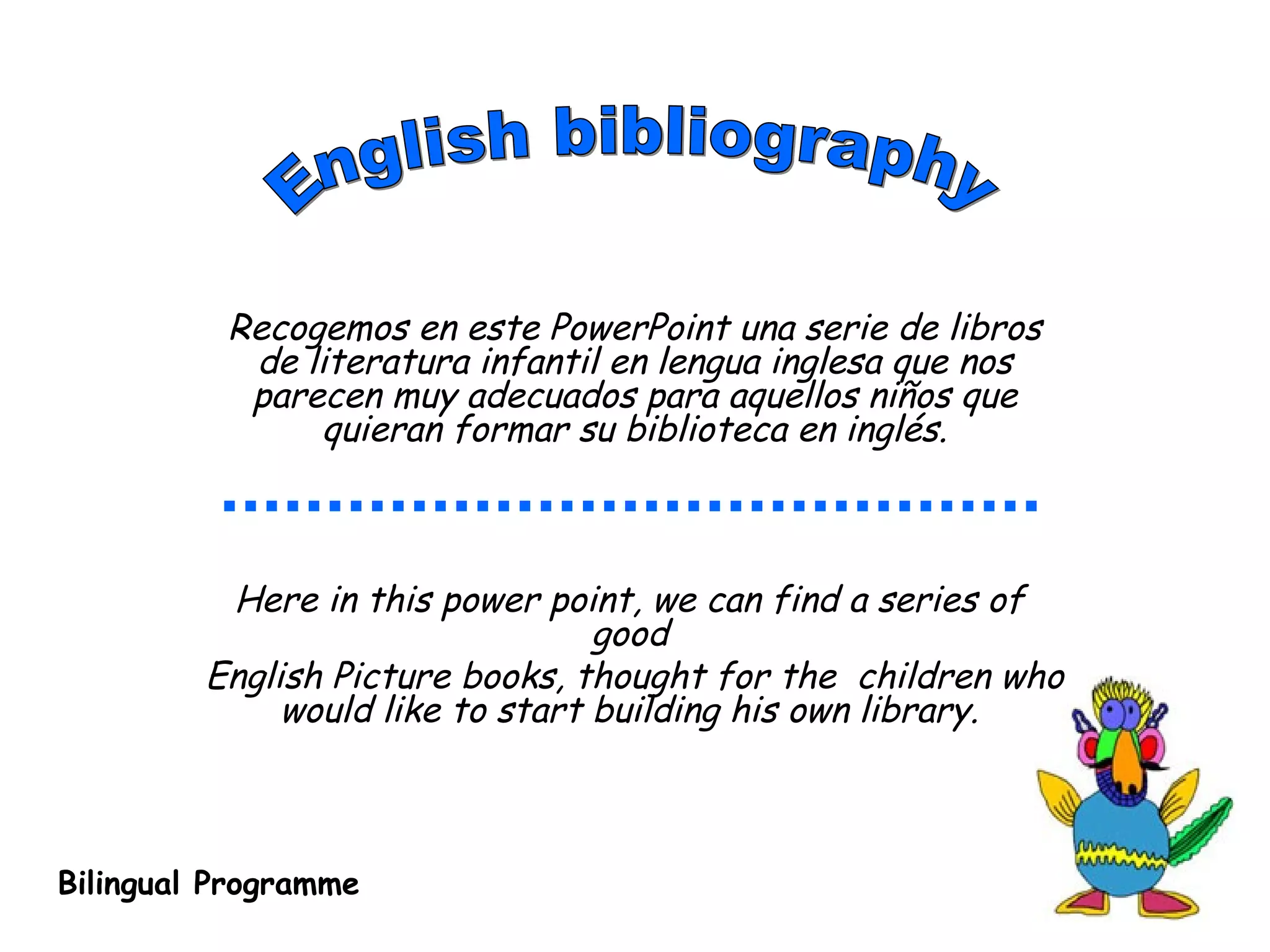 This document provides a summary of English language children's books that would be suitable for building a young child's home library to learn English. It lists over 15 popular picture books written in English, including titles like "Bear About Town", "What shall we do with the Boo Hoo Baby?", "There was an old lady who swallowed a fly", "Not Now, Bernard", and classics like "Brown Bear, Brown Bear, What Do You See?" and "From Head to Toe". The books cover a variety of topics and themes to engage and entertain young readers learning English.
