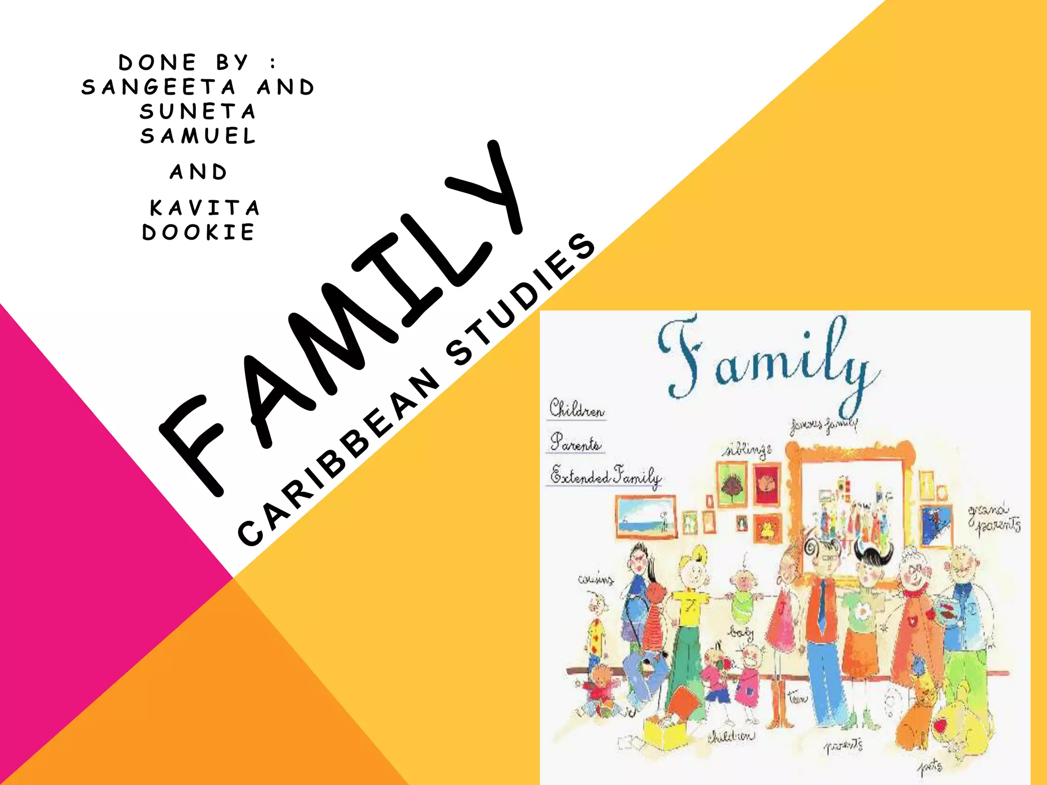 This document discusses different perspectives on the family and various family forms in the Caribbean. It begins by defining the family and describing its functions from a functionalist perspective, including reproduction, socialization, economics, and providing love and belonging. It then discusses the family from a conflict perspective, noting that the nuclear family reflects capitalist values. It outlines different family forms in the Caribbean, including the nuclear family, extended family, single parent family, sibling household, and common-law family. It concludes by examining the impact of family on Caribbean society and culture, including on individuals, groups like African and Muslim families, women, education, and perspectives on the family institution.