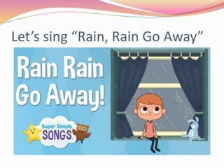 The lesson plan involves singing the song "Rain, Rain Go Away" and repeatedly asking children "Does a dog have a daddy, too?". It concludes with notifying the children that it is time to play a game before ending.
