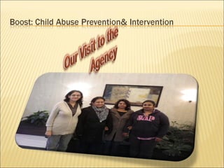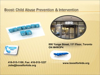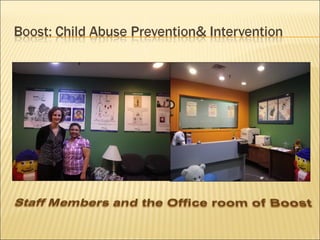 This document provides information about Boost for Kids, a non-profit organization dedicated to preventing child abuse and violence through education and awareness programs. Their mission is to ensure all children grow up in a safe environment. They offer various programs like books teaching self-esteem, workshops on abuse prevention, and counseling support for victims. Services are provided to children in Toronto, but they have long waitlists. They conduct community outreach through initiatives like summer camps and training.
