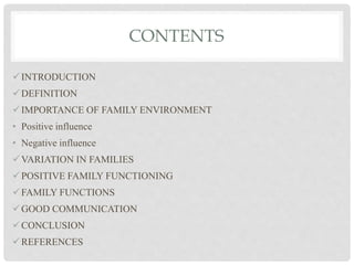 This document discusses the importance of family environment on child development. It defines family environment as the circumstances and social climate within families. A positive family environment with love and mutual support can motivate children and help develop their personality, while a negative environment with neglect can hinder development. Families now come in various forms but ideally involve intimate contact and shared norms. Healthy family functioning requires undertaking roles like childcare and communication, with children nurtured and resources provided. Good communication involves openly expressing ideas even when differing from others. The document concludes that leadership and rules from parents combined with individual responsibility can create a productive family environment that profoundly impacts cognitive development.