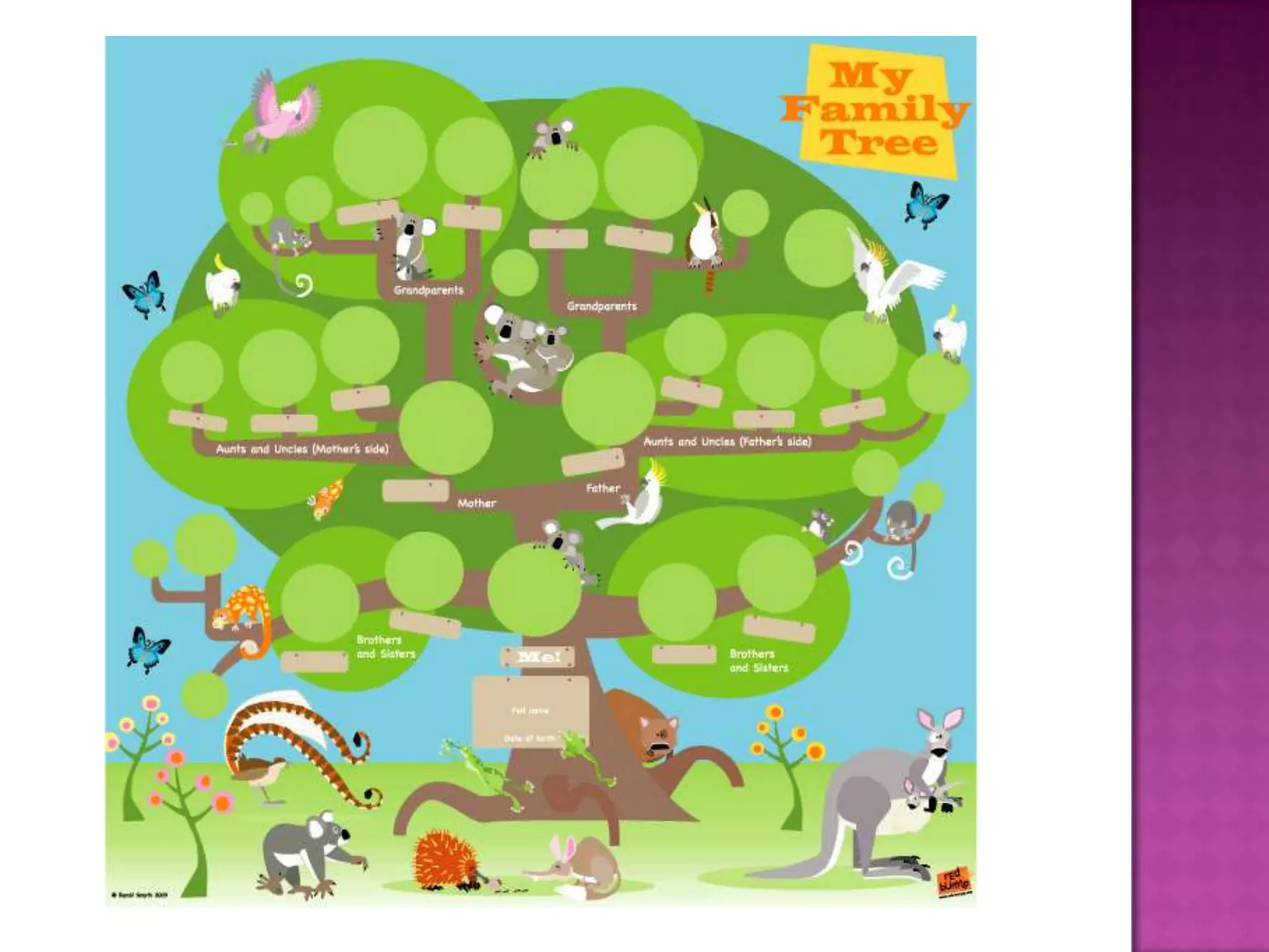 The document provides instructions and prompts for creating a family tree, including listing common family members. It then provides sentence starters for describing activities done with different family members, such as being married with one's dad, playing with a sister, singing with a grandmother, going to the beach with an aunt, and swimming with all of one's family in the summer.
