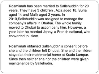 Rosmimah has been married to Sallehuddin for 20 years and they have 3 children together. Sallehuddin took a job in Dubai and the whole family moved there. After a year, he married Jenny in Dubai without divorcing Rosmimah. Rosmimah and the children then returned to Malaysia with Sallehuddin's consent. Sallehuddin did not provide maintenance. The document discusses whether Rosmimah and the children are entitled to maintenance given the circumstances. It also discusses the rights of inheritance for both Rosmimah and Jenny in the event of Sallehuddin's death considering the properties acquired during his marriages.