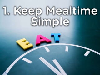 The document provides tips for managing a family schedule effectively, emphasizing the importance of meal planning, setting reminders, and creating a family calendar. It encourages prioritizing family time and sharing responsibilities to achieve realistic goals. A clean home is suggested as a way to ease scheduling pressures.
