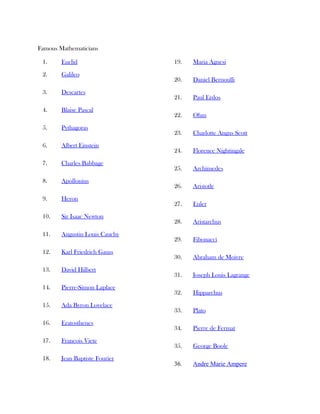 The document provides instructions for a PowerPoint presentation assignment on a famous mathematician. Students must choose one mathematician from a list of 35 options and create a 10-slide presentation covering their biography, contributions to math/science, how modern math is influenced by their work, and an example of a formula or problem they solved. The presentation will be graded on inclusion of biography details, analysis of their contributions and influences, inclusion of two trivia facts, and an example of their work. The due date is also provided.