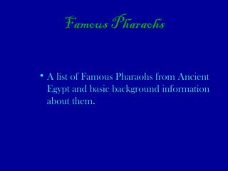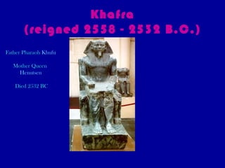 The document provides brief biographical information on several famous Egyptian pharaohs including their names, reign periods, parents, children, dates of birth and death, and burial locations. It describes Khafra who built the second Great Pyramid at Giza and died in 2532 BC, Amenhotep I who was the son of Ahmose I and possibly buried in Dra Abu el-Naga, and Hatshepsut, Egypt's powerful female pharaoh who ruled from 1498-1483 BC and was buried in tomb KV20.