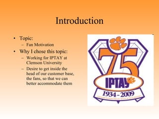 This document discusses fan motivation in collegiate athletics. It presents 5 arguments from research studies about what motivates fans: