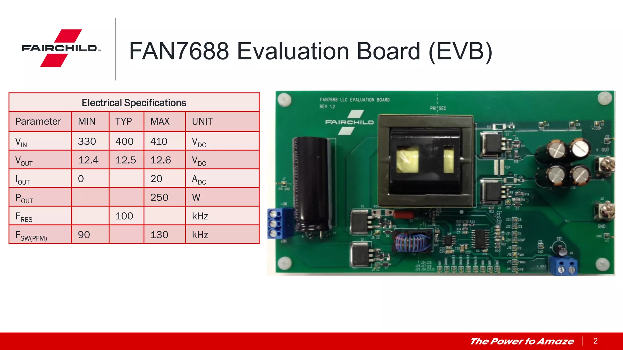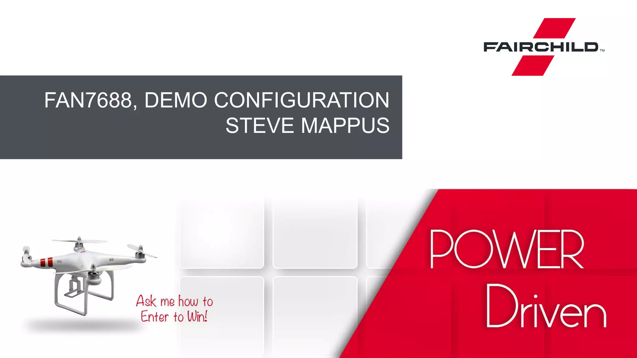 This document provides instructions for demonstrating a FAN7688 demo configuration at APEC 2015. The demo uses a FAN7688 evaluation board (EVB) with secondary-side SR control operating at 12.5V output from 330-410V input and up to 20A output. Diagrams and instructions explain how to connect oscilloscopes, power supplies and loads to the EVB and how to safely power up and down the demo. Contact information is provided for technical support.