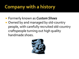 The document summarizes a business plan for a custom shoe company called Fancy Footwear. The company was formerly known as Custom Shoes and was owned by Franco and Giovanni. When they retired, they sold the business to Peter Sunrocco who made changes too quickly without communicating, causing some craftsmen to leave. Peter asked for help and was advised to slow down changes, communicate more with employees, and get to know them before fully implementing plans. The summary outlines steps for growth including differentiation, customer service, training, research, and eventual expansion.