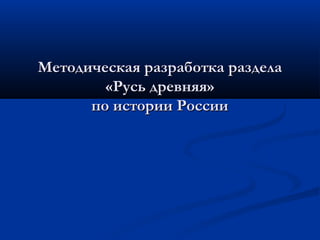 Документ представляет методическую разработку раздела «Русь Древняя» по истории России, направленную на знакомство учащихся со становлением древнерусского государства и устройством восточнославянского общества. Основные цели включают развитие интереса к русской истории и воспитание патриотизма через изучение культурных достижений и общественных отношений XI века. В нем также рассматриваются вопросы языка, письменности, архитектуры и искусства, подчеркивающие взаимодействие языческих и христианских элементов в культуре Древней Руси.