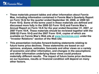 This document provides information from Fannie Mae's 2008 Q3 10-Q Credit Supplement. It includes tables and analysis on Fannie Mae's single-family mortgage credit book of business, including details by key product features, state, vintage, and delinquency rates. It also provides forecasts for future home price declines in 2008 and from peak to trough, expected to be in the upper end of estimated ranges of 7-9% and 15-19%, respectively.