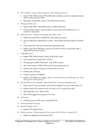 The document provides error codes displayed on the 7 segment LED of GE Fanuc Series 10, 11, and 12 controls along with troubleshooting procedures. Common error codes include A for an MDI connection failure requiring checking the optical cable, C for an MDI failure due to incorrect ID number requiring checking the CRT/MDI unit type, and E for a system error requiring checking cable connections to the master PCB. The document also lists optical interface cable part numbers for the controls.