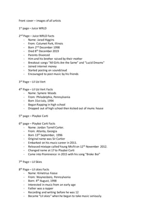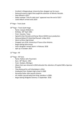 This document provides biographical facts about several popular rappers including Juice WRLD, Lil Uzi Vert, Playboi Carti, Lil Skies, Travis Scott, and NF. It includes their real names, places of birth, notable songs and albums, record labels they have worked with, relationships, and other personal details from their lives and careers.