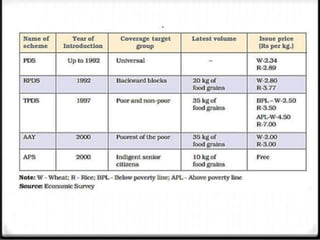 Food security is defined as having access to sufficient, safe, and nutritious food. The FAO and WHO work to address food security globally. The FAO leads international efforts against hunger and India is a founding member. The WHO works on health issues and India joined in 1948. Definitions of food security have evolved over time to include availability, accessibility, affordability, and stability. The four pillars of food security are availability, access, utilization, and stability according to the FAO. India faces issues with over 200 million undernourished people and the government has implemented programs to address food security such as PDS, MDM, and employment guarantees.