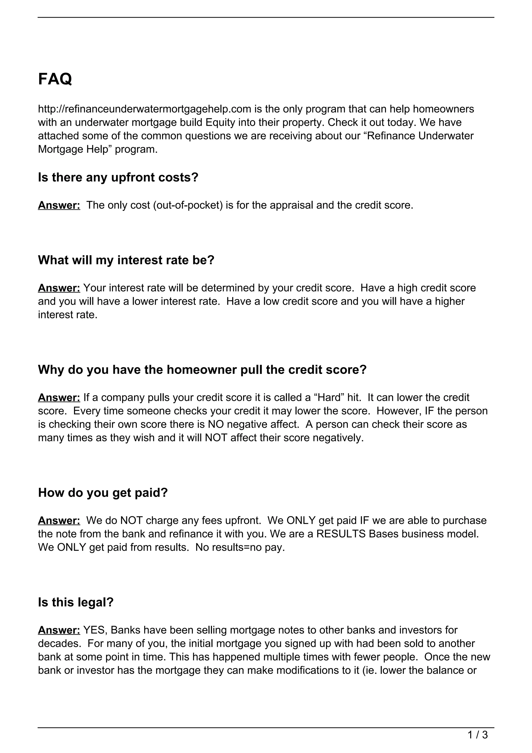This document contains frequently asked questions about an underwater mortgage refinance program. It explains that the program can help homeowners build equity by refinancing underwater mortgages. There are no upfront fees other than an appraisal and credit check. Interest rates are based on credit scores. The program only gets paid if a mortgage is successfully refinanced, so they are motivated to complete deals. The refinance process takes 6-8 weeks. Homeowners should continue making regular mortgage payments.