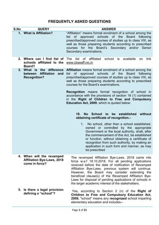 The document provides answers to frequently asked questions about affiliation with the Central Board of Secondary Education (CBSE) in India. Affiliation means a school is formally enrolled with CBSE and follows its approved curriculum, while recognition refers to approval from the relevant state education department. The revamped affiliation bye-laws of 2018 aim to make the process more transparent and simplify procedures. Schools can apply for affiliation to teach the CBSE middle school syllabus or for general affiliation.